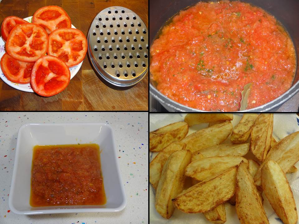 Mientras, hacemos una salsa de tomate. Partimos los tomates por la mitad, les quitamos las pepitas y los rallamos.